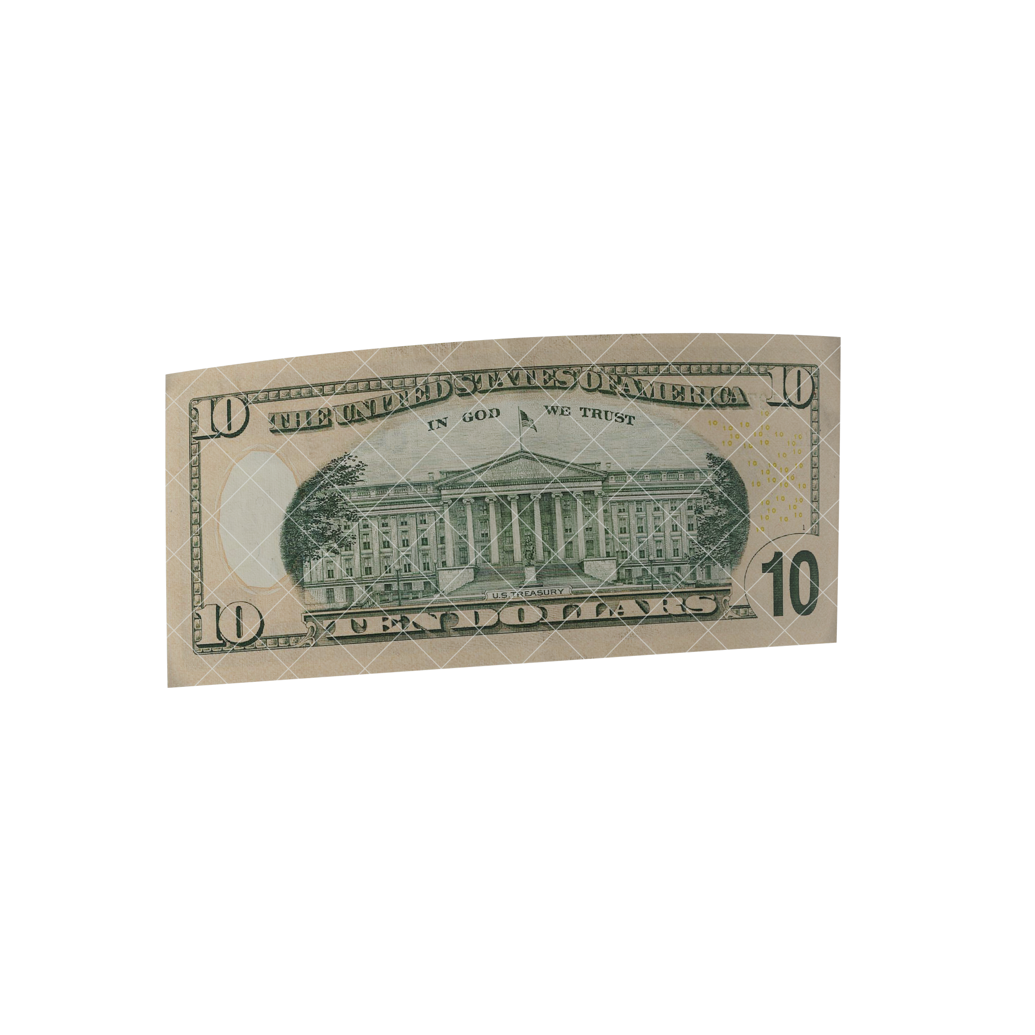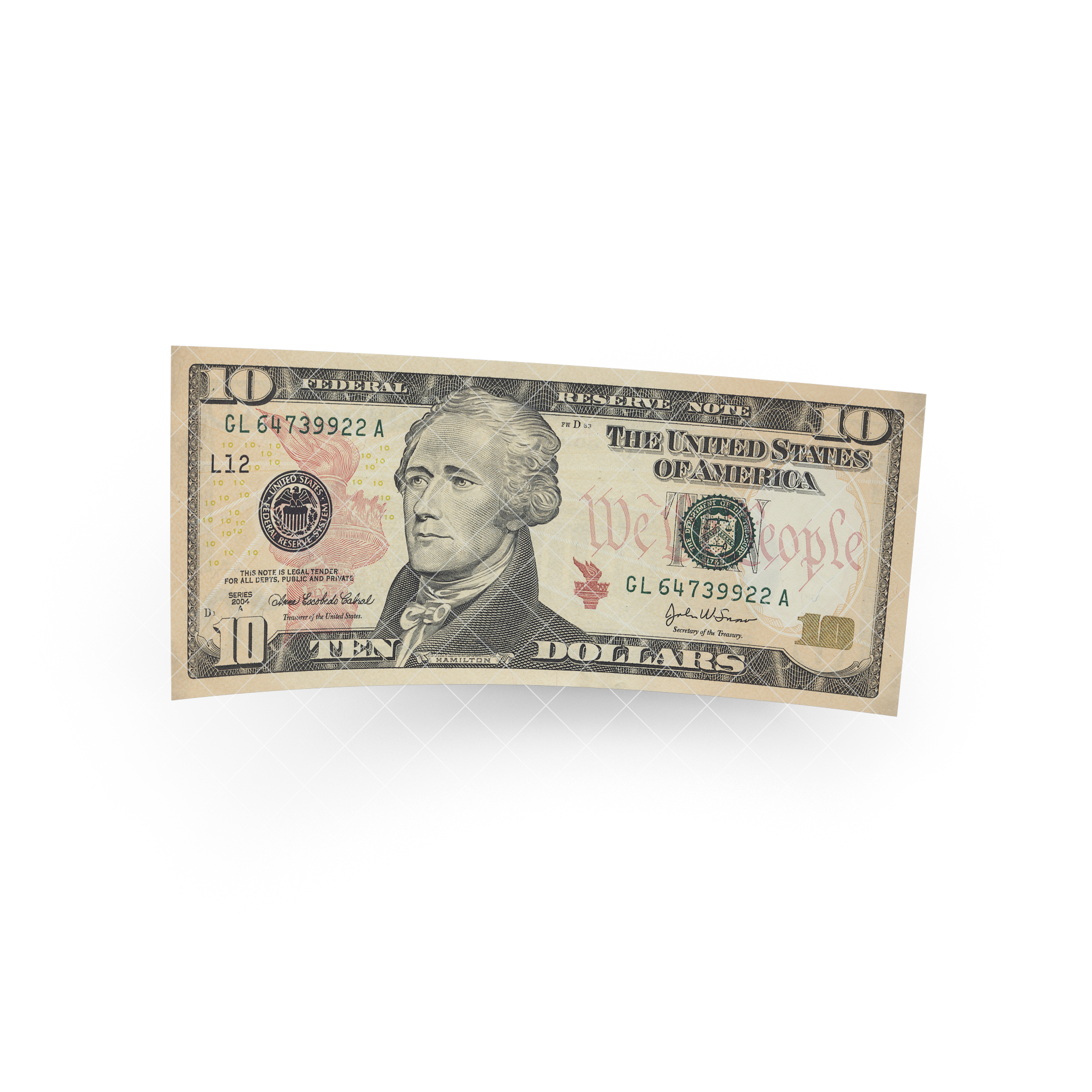 The U.S. $10 bill features Alexander Hamilton on the front, the U.S. Treasury Building on the back, and security elements like a watermark and color-shifting ink. It’s printed in green, blue, and purple on cotton-linen paper.