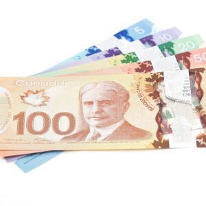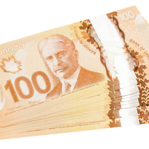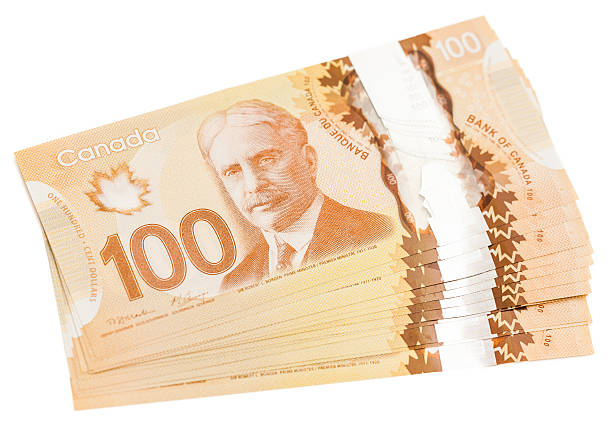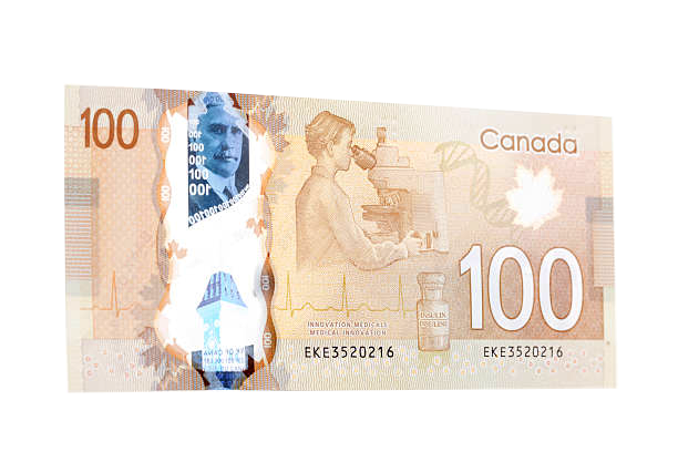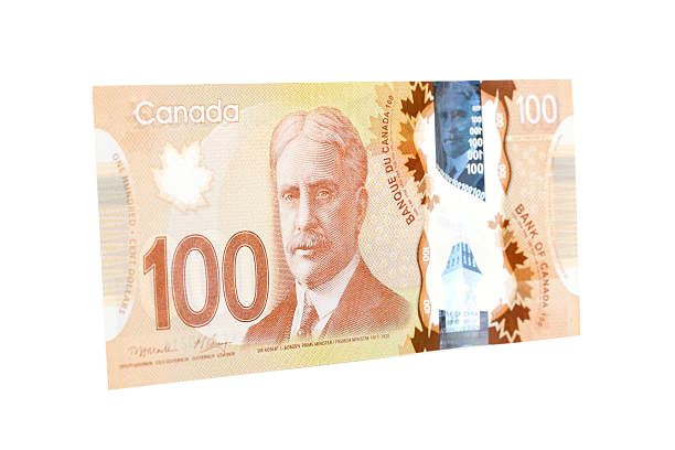 The $100 Canadian bill is 6.3 x 3.1 inches, predominantly purple with blue and green accents. It features a portrait of Robert Borden on the front and a depiction of the Vimy Ridge Memorial on the back.